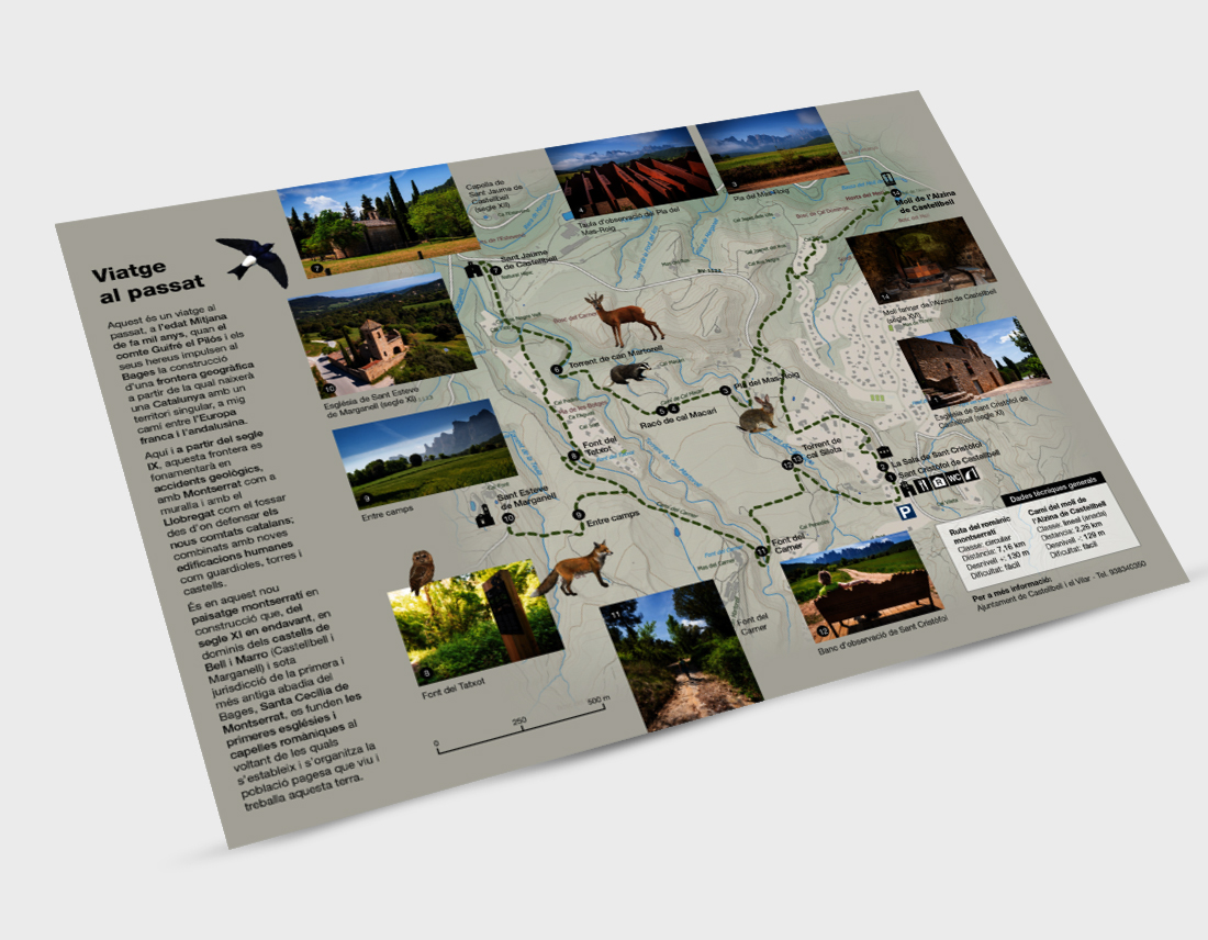 Disseny del trític «Ruta del romànic Montserratí«. Una ruta per experimentar i descobrir el patrimoni cultural, els punts d’observació de Montserrat i els paratges d’interès agrícola, geològic i natural.